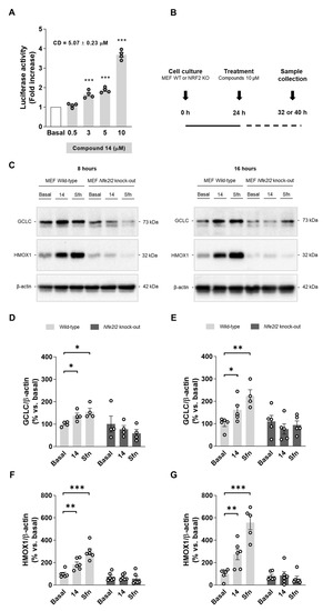 AREc32 cells were stably transfected with the plasmid pGL-8xARE that implements 8 copies of the antioxidant response element (ARE) sequences followed by luciferase reporter gen. Therefore, NRF2 induction can be related to the activation of ARE sequences by measuring luciferase activity in terms of luminescence production. For NRF2 induction experiments, cells were plated in 96 white flat bottom well plates (20,000 cells/well). After 24 h, cells were incubated with selected compounds at the desired concentrations in duplicates for 24 h. The Luciferase Assay System (Promega E1500) was used according to provider protocol and luminescence was quantified in an Orion II microplate luminometer (Berthold, Germany). Fold induction of luciferase activity was normalized to basal conditions. Data were expressed as CD values, which means the concentration needed to duplicate the luciferase activity compared to basal conditions. CD values were calculated from dose–response curves fitted by non-linear regression for each compound after logarithmic transformation of the data using GraphPad Prism 8.0 software.