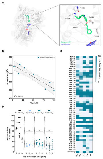 Assays were performed following the general procedure 2.15: Inhibition of monoamine oxidase enzymes (MAO-A and MAO-B), modifying in this case the pre-incubation time. Briefly, 0-, 15-, and 30-min pre-incubation times were used to obtain MAO inhibition activities versus time curves. MAO inhibition activity varies over time for irreversible inhibitors; however, it remains stable for reversible type inhibitors. Rasagiline and clorgyline were used as references of irreversible inhibition for comparative purposes and each compound was incubated at a 1.8xIC50-μM final concentration to observe adequate MAO inhibition.