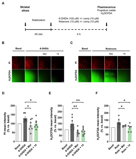 Three- to four-month-old Sprague–Dawley rats were decapitated, the brain was removed, and the two brain hemispheres were separated. Each hemisphere was then cut into 300-µm coronal slices using a McIlwain Tissue Chopper (Cavey Laboratory Engineering, Surrey, UK) and separated in a previously oxygenated (95% O2 and 5% CO2) ice-cold Krebs’s dissection buffer (120 mM of NaCl; 2 mM of KCl; 26 mM of NaHCO3; 1.18 mM of KH2PO4; 10 mM of MgSO4; 0.5 mM of CaCl2; 11 mM of glucose; and 200 mM sucrose at pH 7.4) using a Leica SE6 microscope (Leica, Madrid, Spain). Striatum-containing slices were selected and immediately incubated for stabilization in dissection buffer without sucrose, bubbled with 95% O2 and 5% CO2 for 45 min at 34 °C, allowing slices to recover from slicing injury. Afterwards, brain slices were placed in a 24-well plate containing new medium composed of 1:1 control buffer (120 mM of NaCl; 2 mM of KCl; 26 mM of NaHCO3; 1.18 mM of KH2PO4; 1.19 mM of MgSO4; 2 mM of CaCl2; and 11 mM of glucose) and DMEM/F12 medium (Invitrogen, Madrid, Spain). Slices were exposed for 4 h to 6-OHDA (100 μM) or rotenone (10 μM), and co-incubated with corresponding compounds (10 µM). Saline was used instead of toxics for basal conditions. Finally, cell death and the ROS production were measured.