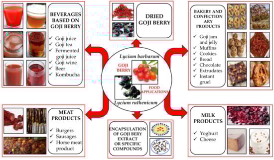 Recently, goji berries have become increasingly used as a raw material for the production of specific beverages, or incorporated into various food products, such as bakery, confectionery, meat, and milk products, contributing to their nutritional, health-promoting, and sensory properties (Figure 2) [,]. The applications of goji berries as functional ingredients in the formulation of different food products are reviewed and shown in Table 4.