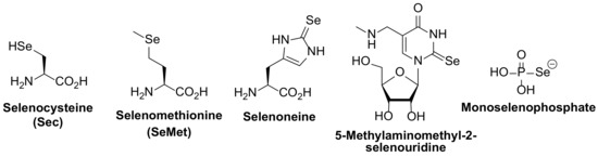 - Hatfield, D.L.; Gladyshev, V.N.; Park, J.M.; Park, S.I.; Chittum, H.S.; Huh, J.R.; Carlson, B.A.; Kim, M.; Moustafa, M.E.; Lee, B.J. Comprehensive Natural Products Chemistry; Kelly, J.F., Ed.; Elsevier: New York, NY, USA, 1999; pp. 353–380. [Google Scholar]