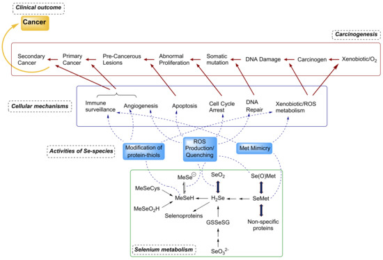 Beyond selenoproteins, different metabolites act at different stages for tumour prevention. Methylselenol, generated in the body from inorganic or organic selenium compounds, is arguably one of the most important among such metabolites [55,56]. Active selenium metabolites include: (i) selenodiglutathione (GS-Se-SG), the reductive metabolite of oxidized inorganic salts (selenite, selenate); (ii) selenomethionine (SeMet), a selenated methionine analogue which represents the main form of selenium in food; (iii) hydrogen selenide (H2Se), the common intermediate of the reductive pathway and the catabolism of seleno-amino acids; (iv) methylated metabolites of selenide such as CH3SeH (methylselenol), (CH3)3Se+ (trimethylselenonium), CH3SeCys (methylseleno-cyeteine) and CH3SeO2H (methylseleninic acid). Such metabolites play various roles that influence the selenium anticarcinogenesis both at underlying and intermediate levels (Figure 2). For example, GSSeSG has been reported to enhance apoptosis, inhibit the DNA-binding of AP-1 (activator protein 1) transcription factor, and inhibit cell proliferation. Methylated selenium derivatives induce apoptosis in breast carcinoma, hepatoma and neuroblastoma cells [56]. Their possible role in inhibiting neo-angiogenesis of activated endothelial cells has also been reported. Indeed, precursors of methylselenol have been shown to inhibit the expression of vascular endothelial matrix metalloproteinase-2 and growth factor in cancer cells [56,58].