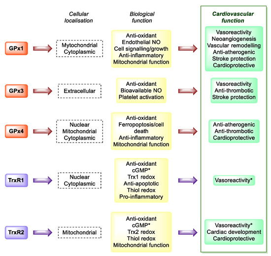 GPxs and TrxRs and their relationships with cardiovascular health. * It is unclear whether both TrxR1 and TRxR2 contributes to this function [134].