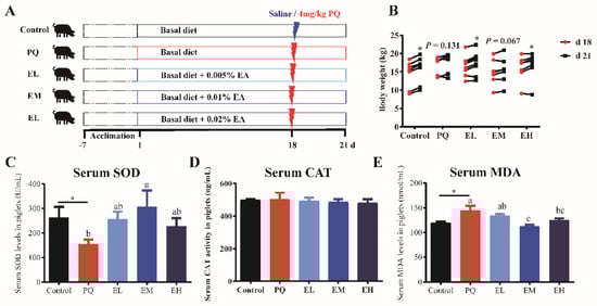 A total of 40 piglets (Duroc × Landrace × Yorkshire) weaned at 21-d of with an average initial body weight (BW) of 8.81 ± 0.34 kg were randomly assigned to five treatments (n = 8) as follows: control group (control, basal diet), PQ group (PQ, basal diet), low dose EA group (EL, basal diet + 0.005% EA), middle dose EA group (EM, basal diet + 0.01% EA), and high dose EA group (EH, basal diet + 0.02% EA) (Figure 1A). The basal diets (Table 1) were formulated to meet the nutrient requirement of piglets recommended by National Research Council (2012). On day 18 of the experiment, piglets in PQ, EL, EM, and EH groups received an intra-peritoneal injection of PQ at 4 mg/kg of BW [23,24]. Piglets in the control group were injected with the same volume of isotonic saline. The three doses of EA (0.005%, 0.01%, 0.02%) were selected according to a human study that determined the EA bioavailability and bioactivity in health young volunteers [25]. The dose of EA was converted from human to pig using the equivalent calculation based on body surface area [26]. All pigs were individually housed in pens with hard plastic slatted flooring, and ad libitum access to experimental diet and water throughout the 21-d study.