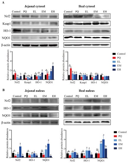 Nrf2 is blocked in the cytosol by its inhibitor Keap1 when cells stay at equilibrium redox state. It is released from Keap1 and translocated into the nucleus, where it binds with elements participated in transcription of genes coding antioxidant enzymes, when the redox state is out of balance [37]. In jejunal mucosa, EA stimulated the Nrf2-Keap1-HO1/NQO1 signaling pathway by enhancing Nrf2 protein levels in the EL and EM groups, and enhancing HO1 protein levels in the EH group. In ileal mucosa, EA stimulated Nrf2 signaling pathway mainly by inducing Keap1 protein expressions (Figure S1C,D). We also detected the relative protein levels of Nrf2, Keap1, NQO1, and HO-1 in cytosol or nucleus of jejunal and ileal mucosa (Figure 2A,B). Compared with the control group, PQ increased Nrf2 but decreased Keap1 protein levels in cytoplasm of jejunal and ileal mucosa, as well as decreased Nrf2 protein levels in nucleus of jejunal and ileal mucosa. EL and EM treatments promoted the nuclear transportation of Nrf2 protein exhibited by increasing its levels in nucleus of jejunal and ileal mucosa. Meanwhile, PQ decreased HO-1 protein abundances in jejunal and ileal cytoplasm and nucleus, as well as decreased NQO1 protein abundances in ileal cytoplasm while increased that in jejunal cytoplasm. In jejunal and ileal mucosa, EL and EM treatments increased NQO1 protein expressions in nucleus, and EH increased HO-1 protein expressions in cytoplasm.