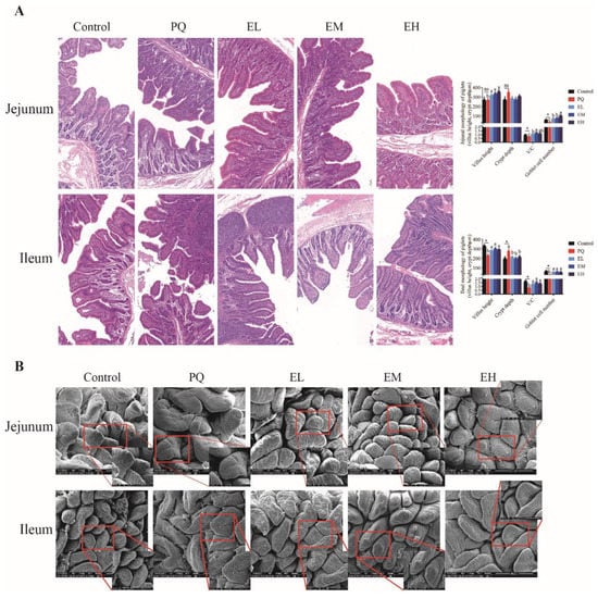Intestinal mucosal morphology of piglets. (A) The histological representative images and histogram of morphological parameters of jejunal and ileal mucosa (magnification 200×). (B) Scanning electron microscopy analysis of jejunal and ileal mucosa (magnification 400×, 1000×). PQ = 4 mg/kg paraquet; EL = 0.005% ellagic acid + 4 mg/kg paraquet; EM = 0.01% ellagic acid + 4 mg/kg paraquet; EH = 0.02% ellagic acid + 4 mg/kg paraquet. n = 8. Data are shown as mean ± SEM. * means the difference was significant when compared to the control group. ns means the difference was not significant when compared to the control group. a–c Values with different lowercase letters are significantly different among PQ, EL, EM, and EH groups (p < 0.05).
