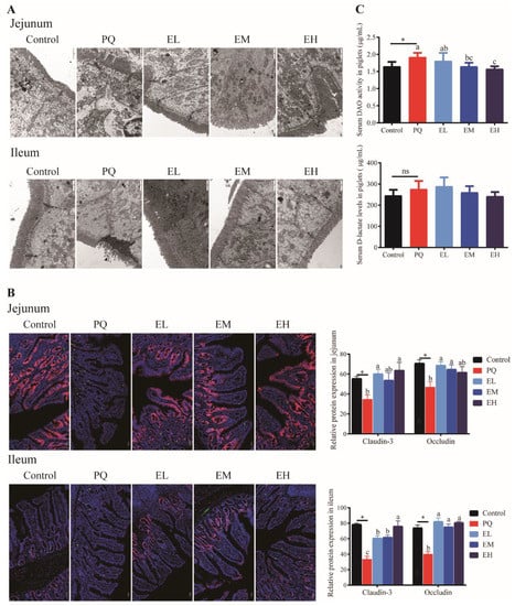 Tight junction structure and permeability of jejunal and ileal mucosa of piglets. (A) Representative electron photomicrograph and quantification of microvillus and tight junction; the microvillus and the tight junction are indicated by the black arrow and the white arrow, respectively. (B) The expression of tight junction proteins (Red: Claudin3; green: Occludin) in jejunal and ileal mucosa. (C) Serum diamine oxidase (DAO) and D-lactate (DLA) levels. PQ = 4 mg/kg paraquet; EL = 0.005% ellagic acid + 4 mg/kg paraquet; EM = 0.01% ellagic acid + 4 mg/kg paraquet; EH = 0.02% ellagic acid + 4 mg/kg paraquet. n = 8. Data are shown as mean ± SEM. * means the difference was significant when compared to the control group. ns means the difference was not significant when compared to the control group. a–c Values with different lowercase letters are significantly different among PQ, EL, EM, and EH groups (p < 0.05).