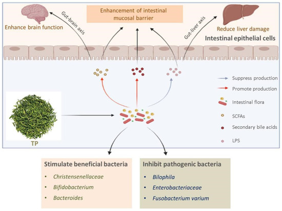TP has a regulatory effect on intestinal flora and influences the production of intestinal microbial metabolites, including SCFAs, lipopolysaccharides (LPS), and secondary bile acids. Through extensive animal experiments, the researchers found that the content of SCFAs in the intestine of animals treated with TP would be increased, and this phenomenon led to some new thoughts [52,59]. Ding et al. [60] found that six-brewed tea extract increased the abundance of several microorganisms that may produce SCFAs in the intestine of mice, including Lactobacillus, Bacteroides, and Ruminococcaceae, and this finding could provide a solid basis for the increased content of SCFAs in the intestine of animals treated with TP. Moreover, in another study, the researchers obtained the aqueous extract of black tea by steeping it in hot water, and the phenolic compounds were determined by high-performance liquid chromatography to test the inhibition of α-glucosidase and α-amylase activities. It was found that the higher the phenolic compounds, the better the inhibition effect on α-glucosidase and α-amylase activities. Therefore, it was concluded that TP had an inhibitory effect on α-glucosidase and α-amylase activities [61]. We can further consider that most of the SCFAs come from indigestible carbohydrates that reach the intestine through fermentation by intestinal microorganisms, and this experimental result represents that TP can allow more carbohydrates available to intestinal microorganisms to enter the intestine as substrates for the production of SCFAs. SCFAs not only strengthen the body’s immune system but are also chemical mediators of intestinal communication with the brain and play a key role in maintaining the body’s health [62,63]. Secondary bile acids, another important intestinal microbial metabolite, are obtained from primary bile acids that flow into the intestine through a series of transformations by intestinal microorganisms. Experiments by Sinha et al. [64] showed that disturbed intestinal flora inhibited the production of secondary bile acids and contributed to the development of intestinal inflammation. The ameliorative effect of TP on intestinal flora has been demonstrated by experimental results showing that TP increases the abundance of secondary bile acid-producing microorganisms in the intestine, such as Bacteroides and Bifidobacterium [52]. Secondary bile acids act on immune cells and enhance the body’s immune system [65]. In addition to promoting the production of certain microbial metabolites, TP can also inhibit the production of certain metabolites, such as LPS. Studies have shown that excessive LPS can cause liver damage and related inflammatory responses, while TP can reduce the relative abundance of lipopolysaccharide-producing microorganisms, which can effectively reduce the accumulation of LPS and maintain human health [66,67]. The metabolites of intestinal flora have great potential for further research, and we can hypothesize whether, in the future, we can have beneficial effects on the human body by promoting or inhibiting the production of one or more metabolites? Further research is needed on this point.