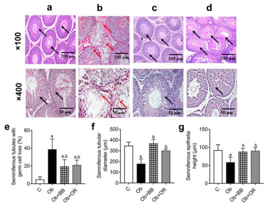 Representative photomicrographs of H&E staining of testes in (a) C, (b) Ob, (c), Ob + BB (d) Ob + OR groups. C: control; Ob: obese rats; Ob + BB: obese + bee bread (6 weeks after induction of obesity); and Ob + OR: obese + orlistat (6 weeks after induction of obesity). The seminiferous tubules in the Ob group were collapsed showing decreased amount of sperm and germ cells (red arrows) compared to C, Ob + BB and Ob + OR groups (c,d) which showed increased amount of sperm and germ cells as well as normal size seminiferous tubules (black arrows) (magnification of panel above: ×100, scale bar = 200 µm; magnification of panel below: ×400, scale bar = 50 µm). (e) Seminiferous tubule with germ cell loss, (f) seminiferous tubular diameter, and (g) seminiferous epithelial height are quantitative data, values are mean ± SD, n = 6. a p < 0.05 vs. C, b p < 0.05 vs. Ob (one-way ANOVA followed by Tukey post-hoc test).