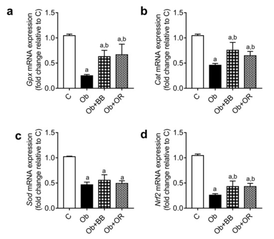 Gpx, Cat, Sod and Nrf2 mRNA transcript levels were decreased significantly in the Ob group relative to the C group. However, these genes, except for the Sod level, were significantly increased in the Ob + BB and Ob + OR groups relative to the Ob group (Figure 2).