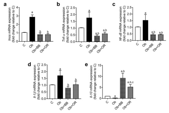 Tnf-α, Nf-κb(p65), Il-1β and Inos mRNA transcript levels increased significantly in the Ob group relative to the C group (p < 0.05). Meanwhile, the mRNA transcript levels of these parameters decreased significantly in the Ob + BB and Ob + OR groups. Additionally, the Il-10 mRNA transcript level was decreased significantly in the Ob group relative to the C group (p < 0.05). Similarly, the Il-10 mRNA transcript level significantly increased in the Ob + BB group relative to the Ob group (Figure 3a–e).