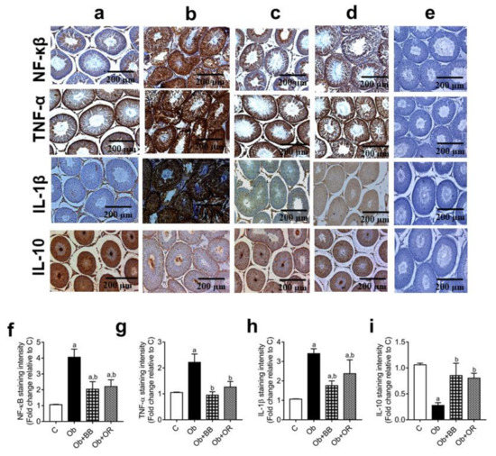 Effects of bee bread on immunoexpression of NF-κB, TNF-α, IL-1β and IL-10 proteins in the testes of obese rats. For each protein, C, Ob, Ob + BB and Ob + OR groups are represented by (a–d), respectively, while (e) represents the negative control (PBS). Staining using immunohistochemistry protocol showed seminiferous tubules with increased expressions of NF-κB, TNF-α and IL-1β, and decreased expression of IL-10 in Ob group, compared to C, Ob + BB and Ob + OR groups. Quantitative data are shown in (f) NF-κB, (g) TNF-α, (h) IL-1β and (i) IL-10. Values are mean ± SD, n = 6. a p < 0.05 vs. C, b p < 0.05 vs. Ob (one-way ANOVA followed by Tukey’s post-hoc test).