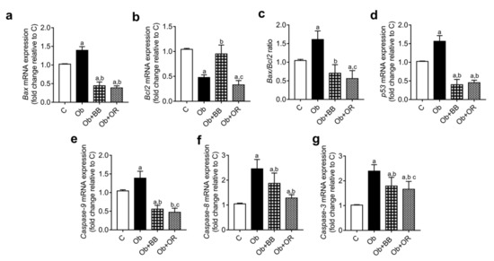 Caspases-3, 8 and 9, Bax and p53 mRNA transcript levels were significantly increased in the Ob group relative to the C group. The mRNA levels of these parameters decreased significantly in the Ob + BB group relative to the Ob group, which was comparable with the Ob + OR group. Meanwhile, the Bcl2 mRNA level significantly decreased in the Ob group relative to the C group but increased significantly in the Ob + BB group which was comparable with the Ob + OR group. The Bax/Bcl2 ratio increased significantly in the Ob group relative to the C group. A significant decrease in this ratio was observed in the Ob + BB group relative to the Ob group (Figure 5a–g).