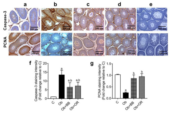 The immunoexpression of PCNA positive germ cells was significantly decreased, and the immunoexpression of Caspase-3 was significantly increased in testis of the Ob group relative to the C group. There were significant increases in the immunoexpressions of PCNA positive germ cells and significant decreases in the immunoexpressions of Caspase-3 in the Ob + BB groups relative to the Ob group, which were comparable with orlistat-treated group (Figure 6a–g).