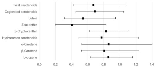 Carotenoids that are abundant in fruits and vegetables have been suggested, in experimental and epidemiological studies, to have anti-inflammatory properties in addition to antioxidant and antiapoptotic properties [9,10,11,12]. During inflammation, immune system-related cells—including macrophages and leukocytes—are evoked at the site of damage, resulting in oxidative stress via the overproduction of reactive oxygen species; carotenoids can act directly or indirectly against such oxidative stress [1]. A recent meta-analysis of randomized controlled trials (RCTs) revealed a protective effect of carotenoids against inflammation [12]. However, these RCTs are not sufficient to show an association between carotenoids and inflammation based on lifestyle factors such as smoking, alcohol intake, and exercise.