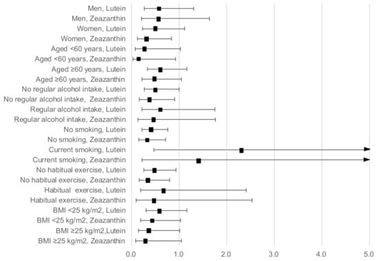 Odds ratios and 95% confidence intervals for a high hs-CRP level with lutein and zeaxanthin concentrations as continuous variables stratified by sex, age, BMI, current smoking, regular alcohol intake, and habitual exercise, adjusted for age, sex, BMI, current smoking, regular alcohol intake, habitual exercise, and total energy intake (excluding the relevant variable used in the stratification).