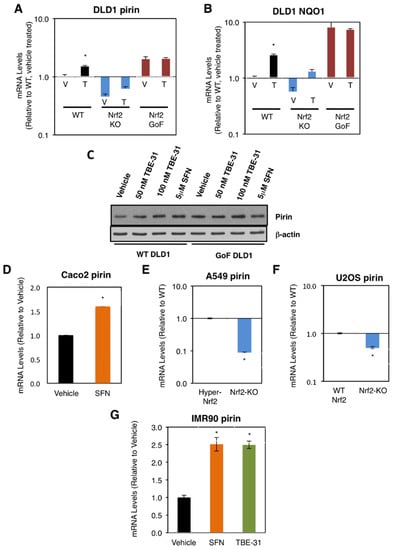 Pirin is a transcriptional target of Nrf2 in human cells. (A,B) mRNA levels for pirin (A) and NQO1 (B) in Nrf2-wild-type (WT), Nrf2-knockout (Nrf2-KO), and Nrf2 gain-of-function mutant (Nrf2-GoF) human DLD1 colorectal cancer cells treated with vehicle (V) or 10 nM TBE-31 (T) for 16 h. (C) Protein levels for pirin in Nrf2-wild-type (WT) and Nrf2 gain-of-function mutant (Nrf2-GoF) human DLD1 colorectal cancer cells treated with vehicle, 50 nM TBE-31, 100 nM TBE-31, or 5 μM sulforaphane (SFN) for 16 h. (D) mRNA levels for pirin in Caco2 colorectal cancer cells treated with vehicle or 5 μM SFN for 24 h. (E) mRNA levels for pirin in A549 cells (high Nrf2 levels, “Hyper-Nrf2”) and their Nrf2-knockout (Nrf2-KO) mutant counterparts. (F) mRNA levels for pirin in U2OS cells (normal Nrf2 levels, WT Nrf2) and their Nrf2-knockout (Nrf2-KO) mutant counterparts. (G) mRNA levels for pirin in IMR90 normal human lung fibroblasts treated with vehicle, 5 μM SFN or 100 nM TBE-31 for 16 h. * p < 0.05. The TaqMan data were normalized using human hypoxanthine phosphoribosyltransferase 1 (Hprt1) as an internal control.
