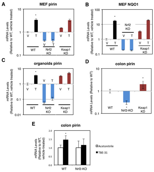 The dependence on Nrf2 of both basal and inducible expression of pirin and NQO1 was also observed in primary cultures of mouse embryonic fibroblast (MEF) cells, intestinal organoids, and in the murine colon in vivo. For these experiments, we used wild-type (WT), Nrf2-knockout (Nrf2-KO, Nrf2−/−) and Keap1-knockdown (Keap1-KD, Keap1flox/flox) mice [19,24,27]. Compared to WT, the mRNA levels for pirin were 60% lower and not inducible by TBE-31 in Nrf2-knockout MEF cells, whereas these levels were 1.5-fold higher in their Keap1-knockdown counterparts (Figure 2A). The basal and TBE-31 induced expression of NQO1 in the three genotypes paralleled that of pirin (Figure 2B).
