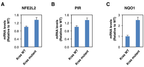 Although Nrf2 is primarily regulated on the protein level, oncogene-induced Nrf2 overexpression has also been reported [28]. Thus, it has been shown that the expression of an endogenous oncogenic allele of K-Ras(G12D) in mouse embryonic fibroblasts increases the transcription of Nrf2 [28]. Therefore, we compared the expression of Nrf2, pirin, and NQO1 in K-RasWT/− and K-RasG13D/− DLD1 cell lines. We found that the mRNA levels for Nrf2 were 1.3-fold higher in the oncogenic K-Ras-expressing cell line compared to its wild-type K-Ras-expressing counterpart (Figure 4A), confirming the transcriptional upregulation of Nrf2 under conditions of K-Ras activation. The mRNA levels for pirin (Figure 4B) and NQO1 (Figure 4C) were also increased in the oncogenic K-Ras-expressing cells by 1.3- and 2.5-fold, respectively, in agreement with Nrf2 activation. Together with the analysis of the human tissues, these data indicate that Nrf2 is activated in human colorectal cancers, and this activation is likely mediated by both transcriptional and post-transcriptional mechanisms.