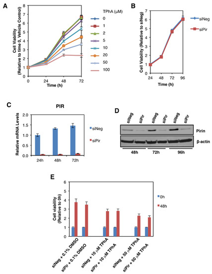 Pirin does not affect the viability of DLD1 colorectal cancer cells. (A) DLD1 cells (5 × 103 per well) plated in 96-well plates were treated with the indicated concentration of TphA for 24-, 48- and 72 h. Cell viability was assessed using the Alamar Blue fluorometric assay. (B) DLD1 cells (5 × 103 per well) were transfected with 20 nM ON-TARGET plus Smart Pool siRNA against human PIR (siPir) or ON-TARGET plus Non-targeting Control Pool (siNeg). Cell viability was monitored for four days after transfection with Alamar Blue reagent. (C) mRNA levels for pirin in DLD1 cells transfected with 20 nM siNeg or siPir for 24-, 48- and 72 h. (D) Protein levels for pirin in DLD1 cells transfected with 20 nM siNeg or siPir for 48-, 72- and 96 h. (E) DLD1 cells (5 × 103 per well) were transfected with 20 nM siNeg or siPir for 48 h, and then treated with 0.1% DMSO, 10 μM or 50 μM TPhA. Cell viability was assessed using the Alamar Blue fluorometric assay at 0- and 48 h after treatment.