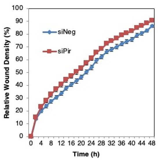 We then asked whether pirin affects the migration of DLD1 colorectal cancer cells using a well-established functional wound-healing assay. To this end, cells were transfected with pirin siRNA or siRNA negative control as above, grown to confluency, and subsequently serum starved to prevent cell proliferation. A uniform scratch wound was then introduced in the confluent cell monolayer in a tightly-controlled manner, and the resulting wound closure was monitored by real-time imaging. Depleting pirin by siRNA had no significant effect on wound closure (Figure 6), suggesting that under these experimental conditions, pirin does not affect cell migration.