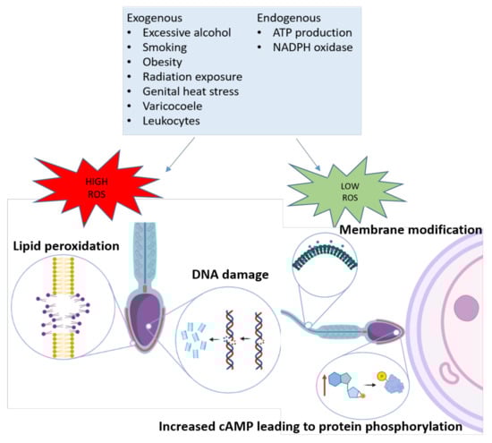 Reactive oxygen species are an oxygen containing molecule that has a free electron or unstable bond and it is these characteristics that allow the molecule to react with nucleic acids, lipids, proteins, and carbohydrates within cells. An over production of ROS has been implicated in the development of aging and many chronic and degenerative diseases including cancer, chronic obstructive pulmonary disease, cardiovascular disease, neurodegenerative disorders (Alzheimer’s, Huntington’s Parkinson’s, amyotrophic lateral sclerosis, spinocerebellar ataxia, ischemic stroke) and inflammatory bowel disease [13,14,15]. Many forms of ROS are found in sperm including superoxide (O2−), hydrogen peroxide (H2O2), hydroxyl radical (OH), peroxyl (ROO−), singlet oxygen (O2), nitric oxygen (NO), peroxide ion (O22−) and hydroxyl ion (OH−) all which have different biological targets with their own spectrum of reactivity [16,17]. ROS generation in sperm and seminal plasma can occur (i) endogenously as a by-product of aerobic metabolism and ATP production in sperm mitochondria and the nicotinamide adenine dinucleotide phosphate oxidase pathway (NOX) in sperm plasma membranes or (ii) exogenously from sources such as but not limited to elevated leukocytes in seminal plasma in response to genital tract infection or inflammation, smoking, excessive alcohol consumption, exposure to radiation, genital heat stress and obesity [18,19,20] (Figure 1). A biological concentration of ROS must be present in sperm for normal physiological process such as capacitation, hyperactivation and the acrosome reaction to occur allowing sperm to be primed for successful fertilization. ROS facilitates capacitation through its activation of adenylyl cyclase which then acts to convert ATP into cyclic AMP (cAMP). cAMP’s downstream effects result in the phosphorylating of proteins required for hyperactivation which is assisted by ROS inhibition of tyrosine phosphatases [17,21,22]. ROS is also required for the acrosome reaction and fusion of the gametes, as it oxidizes and extrudes cholesterols within the membrane, thereby increasing its fluidity [23]. However, at either end of the spectrum (either too low or too high) ROS concentrations in sperm can be detrimental.