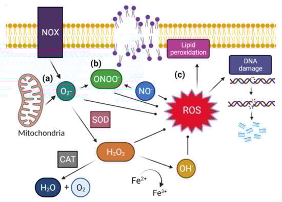 (a) ROS formed within the cell starts as superoxide (O2−) created from ATP generation in mitochondria and from NADPH oxidase (NOX), and superoxide dismutates, facilitated by the protein superoxide dismutase (SOD) into hydrogen peroxide (H2O2). Hydrogen peroxide can then be neutralized by catalase (CAT) to create water (H2O) and singlet oxygen (O2). However, in the presence of ferrous iron it will react, creating hydroxyl radical (OH−). (b) If there is nitric oxide (NO−) present, then it will react to create peroxynitrite (ONOO−), a potent but unstable oxidant. (c) These ROS contribute to sperm damage through oxidation of the guanine base in DNA, creating single strand breaks, double strand breaks and DNA fragmentation, or through its oxidation of polyunsaturated fatty acids, creating lipid radicals that self-propagate, resulting lipid peroxidation.