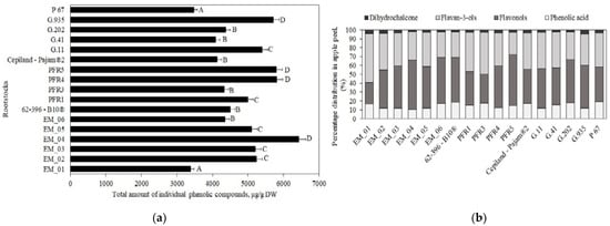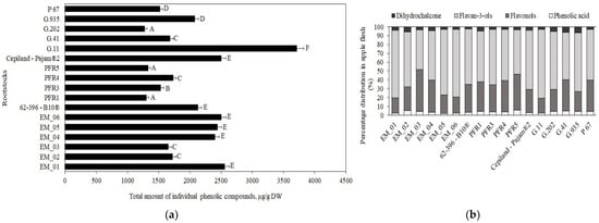 Influence of rootstocks on the quantitative composition of phenolic compounds: (a) Total variation of phenolic compounds in apple peel samples; (b) percentage distribution of phenolic compounds in apple peel samples. The means followed by different letters are significantly different at p < 0.05.