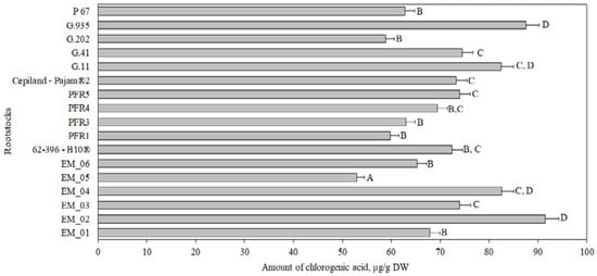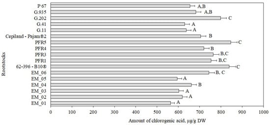 Influence of rootstocks on the quantitative composition of chlorogenic acid in apple peel samples. The means followed by different letters are significantly different at p < 0.05.
