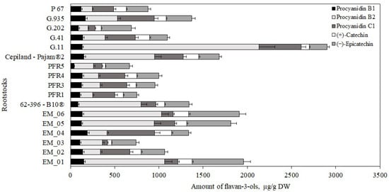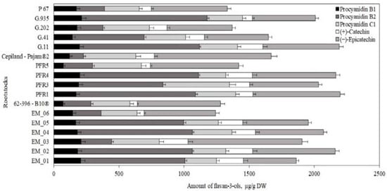 The total amount of flavan-3-ols in apple peel samples varied almost twice depending on the rootstock, from 1243 ± 62 μg/g to 2200 ± 109 μg/g (Figure 8). The highest total amount of flavan-3-ols (2200 ± 109 μg/g) was found in peel samples of apples grown on the semi-dwarf rootstock PFR1, and the smallest amount (1243 ± 62 μg/g) was found in peel samples of apples grown on the semi-dwarf rootstock EM_06 (Figure 8). Slatnar et al. studied apple samples of the ‘Ligol’ cultivar grown on rootstocks M.9, M.26, and P 60, and found that flavan-3-ol content ranged from 280 μg/g to 416 μg/g [40]. In our study, apple peel samples of the ‘Galaval’ cultivar grown on rootstocks had larger amounts of flavan-3-ol on compared to the amount (702 μg/g) found in apple peel samples of the ‘Brookfield Gala’ cultivar [38].