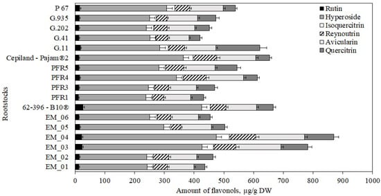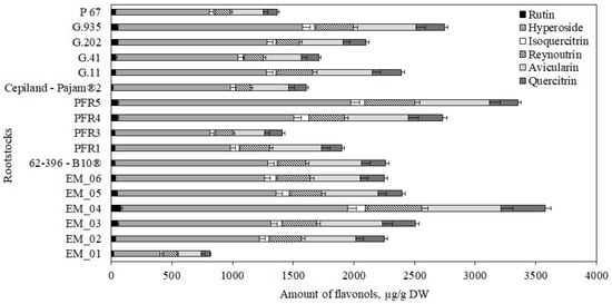 We determined the dynamics of the variation in the content of individual flavonols in apple peel samples depending on the rootstock. The largest amount of hyperoside (1920 ± 96 μg/g) was found in peel samples of apples grown on the dwarf rootstock PFR5, while the lowest (391 ± 15 μg/g) was found in peel samples of apples grown on the semi-vigorous rootstock EM_01 (Figure 9). The largest amounts of avicularin, reynoutrin, quercitrin, isoquercitrin, and rutin (accordingly, 656 ± 33 μg/g, 462 ± 20 μg/g, 366 ± 19 μg/g, 150 ± 8 μg/g, and 79 ± 3 μg/g) were found in peel samples of apples grown on the super dwarf rootstock EM_04 (Figure 9). Meanwhile, the lowest levels of avicularin, reynoutrin, quercitrin, and isoquercitrin (accordingly, 200 ± 10 μg/g, 113 ± 6 μg/g, 69 ± 4 μg/g, and 27 ± 1 μg/g) were found in apple peel samples grown on the semi-vigorous rootstock EM_01 (Figure 9). The smallest amount of rutin (12 ± 1 μg/g) was found in apple peel samples grown on the strong-dwarf rootstock Cepiland-Pajam®2 (Figure 9). Mainla et al. in their study found that the amount of hyperoside in apple peel samples of the ‘Talvenauding’ cultivar grown on rootstocks B.396 and M.26 ranged from 163 μg/g to 463 μg/g [19]. In our study, the amount of hyperoside (1265 ± 64 μg/g) in apple peel samples of the ‘Galaval’ cultivar grown on the rootstock 62-396-B10® was higher than that found by Mainla et al.