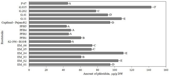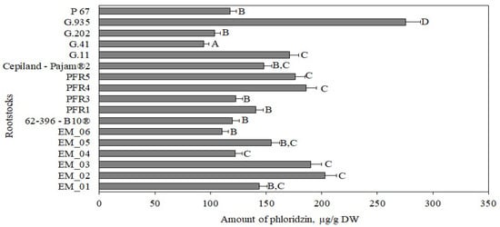 Influence of rootstocks on the quantitative composition of phloridzin in apple peel samples. The means followed by different letters are significantly different at p < 0.05.