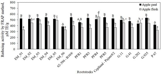 Influence of rootstocks on the reducing activity of apple flesh and apple peel extracts determined by the FRAP method. The means followed by different uppercase and lowercase letters are significantly different at p < 0.05.