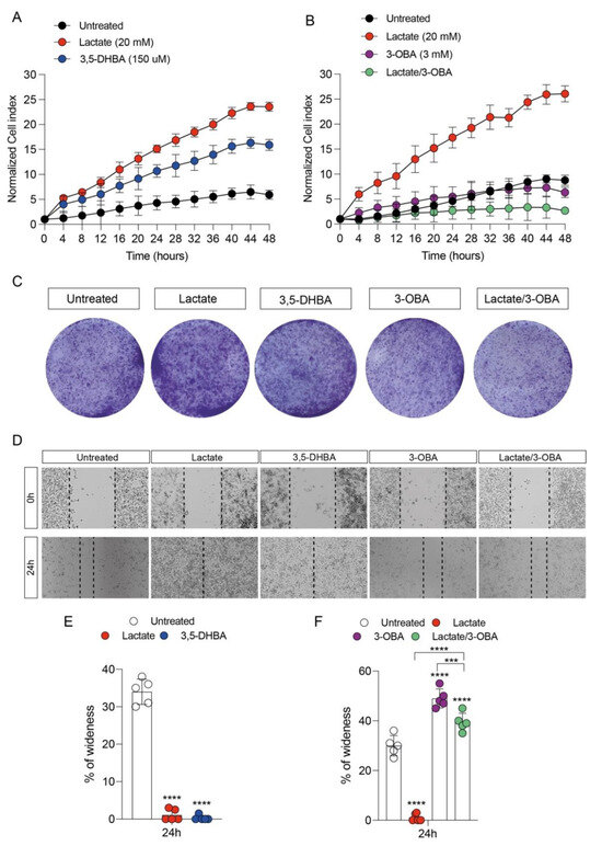 GPR81 stimulation promotes breast cancer cell growth. Effect of lactate (20 mM), 3,5-DHBA (150 μM, GPR81 agonist) and 3-OBA (3 mM, GPR81 antagonist) on cell proliferation (A,B), colony formation capacity (C) and wound healing (D–F). Data are expressed as mean ± SD of at least four independent experiments. (*** p < 0.001; **** p < 0.0001).
