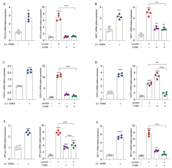 GPR81 modulates mitochondrial metabolism gene expression. Evaluation of relative mRNA expression levels of (A) PGC1alpha, (B) SIRT1, (C) COX IV, (D) COX II, (E) ATPsyn, (F) MCT1, following 24 h of lactate (20 mM), 3,5-DHBA (150 μM) and 3-OBA (3 mM) exposition, analyzed by real-time PCR. The calculated value of 2−ΔΔCt in untreated controls is 1. Data are expressed as mean ± SD of at least four independent experiments. * p < 0.05; ** p < 0.005; *** p < 0.001; **** p < 0.0001.