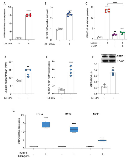 Given the evidence of cell modulation exerted by lactate receptor activation, we tried to link the molecular mechanisms underlying these phenomena with the expression of IGFBP6. To this end, we first analyzed whether lactate increased the expression of IGFBP6. As shown in Figure 3A,B, treatment with lactate in MDA-MB-231 cells resulted in a significant increase in the mRNA relative expression of IGFBP6 (Figure 3A) compared to the untreated control cells. The same effect was found after receptor stimulation (Figure 3B), and, again, the lactate effect was significantly reversed by adding the receptor inhibitor 3-OBA (Figure 3C). Then, to investigate the existence of an axis between lactate, MCT1-4 receptors and IGFBP6, the breast cancer cells were exposed to the recombinant protein IGFBP6 for 24 h. Surprisingly, IGFBP6 treatment induced a significant increase in lactate production in the supernatant of MDA-MB-231 cells (Figure 3D), as well as a significant increase in both mRNA (Figure 3E) and GPR81 protein expression levels (Figure 3F), compared to the corresponding values found in the control cells. To further confirm these data, we performed real-time PCR analysis to evaluate the expression of the LDHA enzyme and lactate transporters MCT1 and MCT4.