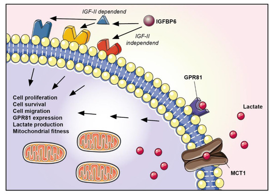 In the last few years, the role of GPR81 has increasingly been studied in all those pathophysiological conditions activated by lactate, particularly in the neurological and oncological fields [16,23,24]. In several cancer cell types, including those of colon, breast, lung, cervical, and pancreatic cancer, GPR81 is highly expressed, suggesting a potential broad role of GPR81 in tumorigenesis. Moreover, GPR81 levels also correlated with the rates of cancer cell proliferation and metastasis in vivo, and were also elevated in xenografted cells. These data suggest that the expression of GPR81 is fundamental for cancer cells within the tumor microenvironment. Altering the cellular metabolism of the tumor microenvironment is a hallmark of cancer, and lactate metabolism has increasingly been recognized to have a critical role in tumor cell survival. In the tumor microenvironment, increased lactate levels significantly activate GPR81, mediating the activation of cell survival signaling [25]. Among the most interesting biological processes reshaping cell metabolism, those that recap developmental processes through IGFBP6 involvement hold great potential to understand tumor-related biological processes, such as cell proliferation, wound healing, senescence, and changes in metabolism [26].