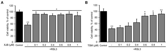 The effects of XJB and TSM on ferroptosis in H9c2 cells. Different concentrations of XJB (A) and TSM (B) in the presence or absence of 0.5 µM RSL3. Cell death was calculated from the measurements by the Alamar Blue cell viability assay, and data are presented as a percentage of the control. GPX4 protein levels were calculated based on densitometry analysis using LI-COR Image Studio Lite and normalized to β-actin expression for each band. Data are presented as a percentage of the control group. ++ p < 0.01 vs. control; * p < 0.05 and ** p < 0.01 vs. RSL3. n = 3 per group.