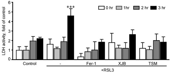 Time-dependence analysis of RSL3-induced cell death in H9c2 cells. LDH activity as a marker of cell death was measured in the culture medium containing H9c2 cells that were exposed to 0.5 µM RSL3 for 1, 2, and 3 h, in the presence and absence of 1 µM Fer-1, 0.2 µM XJB, or 0.6 µM TSM. Data were normalized to the control for each time-point and presented as a fold increase. *** p < 0.001 vs. control. n = 3 per group.