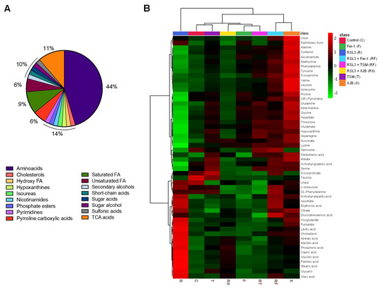 The metabolome of H9c2 cells exposed to ferroptosis. The constituent ratio of the 52 metabolites is identified by class (A). Heatmap for the different conditions as compared to the control and RSL3 displaying average metabolites concentration (mM) for each group (B). The conditions (in the abscise axis) and the bins/metabolites (in the ordinate axis) have been sorted according to cluster analysis. The fold change is color-coded according to the bar legend. C, control; R, RSL3; F, Fer-1; X, XJB; T, TSM; RF, RSL3 + Fer-1; RX, RSL3 + XJB; RT, RSL3 + TSM. Green represents lower concentration; red represents higher concentrations. n = 4–6 per group.