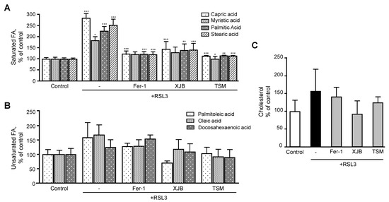 Next, we evaluated the effects of ferroptosis in saturated and unsaturated FA. Analysis of saturated FA revealed that RSL3 increased the levels of capric, myristic, palmitic, and stearic acids by 184% (p < 0.001), 83% (p < 0.05), 126% (p < 0.001) and 153% (p < 0.001), respectively, compared to the control group (Figure 5A). However, treatment of the cells with Fer-1, XJB, or TSM significantly attenuated the effects of RSL3 on the saturated FA levels that were similar to the control group. Unsaturated FA exhibited a certain trend of increasing in RSL3-challenged cells, although the effect was not statistically significant (Figure 5B).