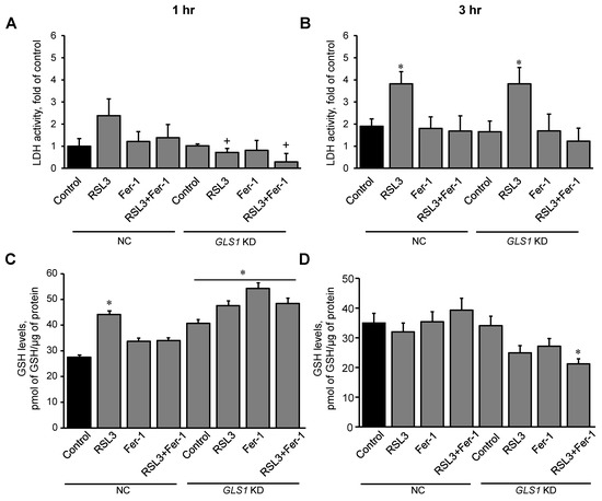 RSL3-induced cell death and GSH levels in GLS1 KD H9c2 cells after ferroptosis. H9c2 cells from non-coding (NC) and GLS KD groups were incubated in the presence and absence of 0.5 µM RSL3, 1 µM Fer-1, or both for 1 (A) and 3 h (B). LDH activity, as a marker of cell death, was measured in the culture medium containing H9c2 cells. Results were normalized to the control. GSH was quantified in mitochondria isolated from the cells after 1 hr (C) and 3 hr (D) of incubation. Data were normalized to a standard curve of GSH which ranged 1-10 µM. * p < 0.05 vs. control (NC), + p < 0.05 vs. RSL3 (NC). n = 3 per group.