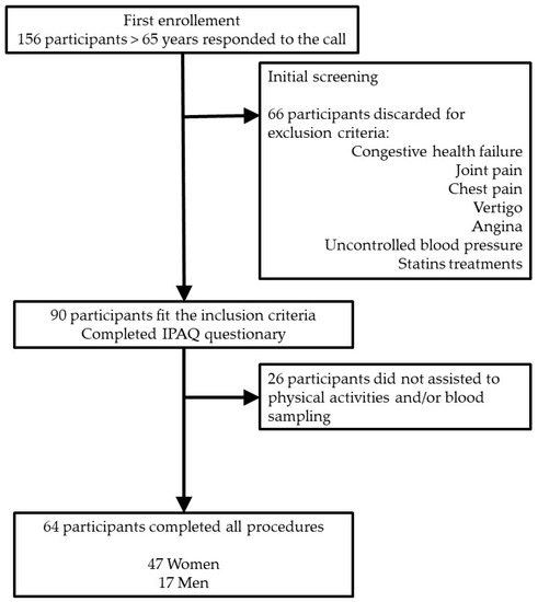 A total of 156 subjects initiated the process of selection. After a first screening in which subjects were asked for their health, diseases and treatments, only 90 of them did not fit the exclusion criteria, and were considered able to perform physical activity tests and blood extraction procedures. During physical activity tests and blood testing, 26 participants did not attend to the session or had problems completing the physical activities. Finally, only 64 participants, 17 men and 47 women, fulfilled all the conditions and participated in all the procedures (Figure 1). Procedures were always carried out in the mornings.