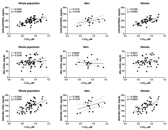 As expected, plasma CoQ10 levels strongly correlated with total cholesterol (Pearson’s r = 0.5594, p < 0.0001) and non-HDL cholesterol (Pearson’s r = 0.5346, p < 0.001) in the whole population (Figure 2). However, when analyzed separately by gender, in men, this correlation was absent for both total cholesterol (Pearson’s r = 0.3716, p = 0.1419) and non-HDLL cholesterol (Pearson’s r = 0.3902, p = 0.1215), whereas it was maintained in women with a stronger correlation coefficient, for total cholesterol (Pearson’s r = 0.6349, p < 0.001) and non-HDL cholesterol (Pearson’s r = 0.5894, p < 0.001). No significant correlation was found with any of the other parameters determined, indicating no clear relationship with other metabolic parameters, even with oxidized LDL cholesterol (Table 4).