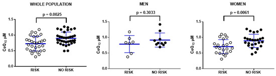 Blood plasma CoQ10 levels (μM) in the participants in relationship with their respective cardiovascular risk determined by a total cholesterol/HDL quotient higher than 4 (risk) or lower than or equal to 4 (no risk). Data represent the mean ± SD of the whole population (n = 64), men (n = 17) and women (n = 47).