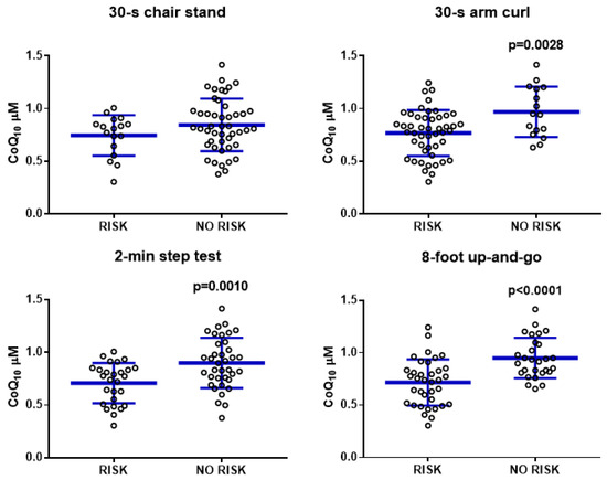 Taking these relationships into consideration, we divided the population according to the risk of frailty depending on the score of the tests of the SFT and determined the levels of CoQ10 in plasma [24] (Figure 4). Participants were considered to be at risk of frailty if they scored fewer than eight repetitions for the 30-s chair stand test, fewer than 11 movements for the 30-s arm curl test, fewer than 40 steps for the 2-min step test, or more than 9 s for the up and go test. With respect to all of these procedures, CoQ10 levels were higher in the population showing a score indicating low or no risk. This relationship was statistically significant in the case of the 30-s arm curl test, the 2 min step test, and the up and go test (Figure 4).