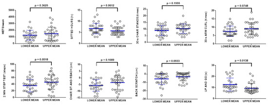 Furthermore, we also performed an analysis of the score in all the tests included in the SFT with respect to the mean of the levels of CoQ10 in plasma. We analyzed the score in the tests of people showing CoQ10 levels below the mean in comparison with people above the mean. This analysis indicated that, in general, people showing higher levels of CoQ10 in plasma score better in all the tests included in the SFT, although this relationship did not reach statistical significance except in the case of the 8 foot up and go test, in which people showing high CoQ10 levels were able to perform this test faster. Furthermore, sedentarism was also lower and near significant in the group showing higher CoQ10 levels (Figure 5).