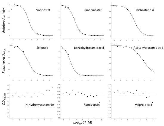 Concentration-dependent inhibitory profiles of the tested molecules. Of the tested molecules, the profiles of 9 molecules are shown. The activities are scaled to have a relative value of 0–1 for vorinostat, panobinostat, trichostatin A, scriptaid, benzohydroxamic acid, and acetohydroxamic acid. The optical densities at 457 nm at the final time interval are presented for N-hydroxyacetamide, romidepsin, and valproic acid.
