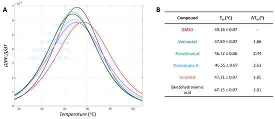 Profiles of differential scanning fluorimetry with tyrosinase and hydroxamate-containing inhibitors. Identical colors are used for the profiles and information for each compound. (A) Profiles. Derivatives of the relative fluorescence unit (RFU) by temperature (D(RFU)/dT) were constructed in the range of 34 °C to 62 °C. (B) Calculated values. Means and standard deviations were obtained from three repeated independent experiments.