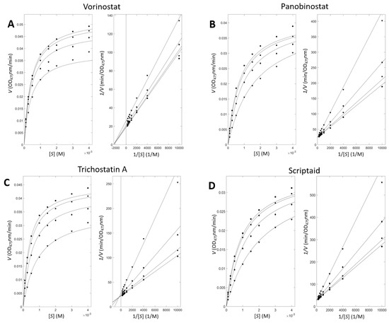 Enzyme-inhibitory kinetics with tyrosinase and inhibitors. (A–E) Left and right panels show Michaelis–Menten and Lineweaver–Burk plots, respectively, for the five representative inhibitors: ●, ■, ♦ and ▼ represent inhibitor concentrations of 100, 250, 750, and 2250 nM for vorinotstat; 20, 50, 150, and 450 nM for panobinostat; 0.5, 1.2, 3.6, and 10.8 μM for trichostatin A; 100, 200, 600, and 1800 nM for scriptaid; and 5, 10, 30, and 90 nM for benzohydroxamic acid, respectively. (F) Kinetics models and simulated inhibitory constants for each inhibitor. The first and second values for trichostatin A mean the inhibitory constants for apo and holo states, respectively.